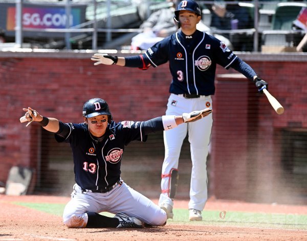 1일 인천 SSG 랜더스필드에서 ‘2022 신한은행 SOL KBO리그’ SSG 랜더스와 두산 베어스의 경기가 열렸다. 1회초 2사 1, 3루에서 두산 3루 주자 허경민이 이중 도루 때 SSG 이흥련의 태그를 피해 홈스틸을 성공시킨 후 환호하고 있다.