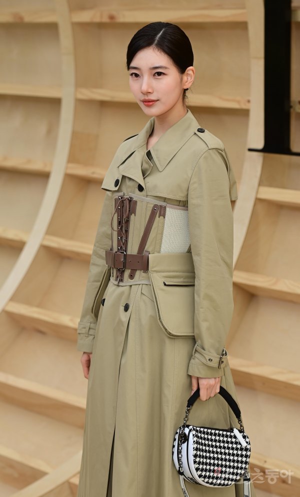 배우 수지가 30일 서울 서대문구 대현동 이화여자대학교에서 열린 한 프랑스 럭셔리 브랜드의 2022 가을 여성 컬렉션 패션쇼 포토월에서 포즈를 취하고 있다.
