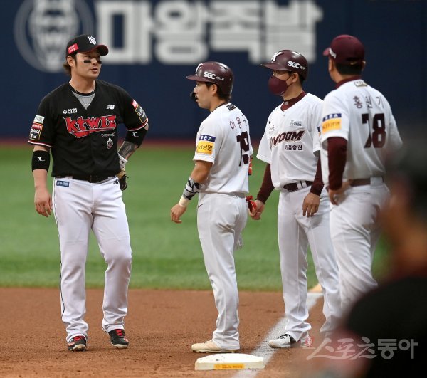 1일 서울 고척스카이돔에서 ‘2022 신한은행 MY CAR KBO리그’ KT 위즈와 키움 히어로즈 경기가 열렸다. 1회말 무사 키움 이용규가 KT 3루수 송구 실책으로 출루한 후 1루로 걸어오다 KT 박병호에게 태그 아웃 되었다. 이 판정에 대한 심판 합의판정을 홍원기 감독과 기다리고 있다.
