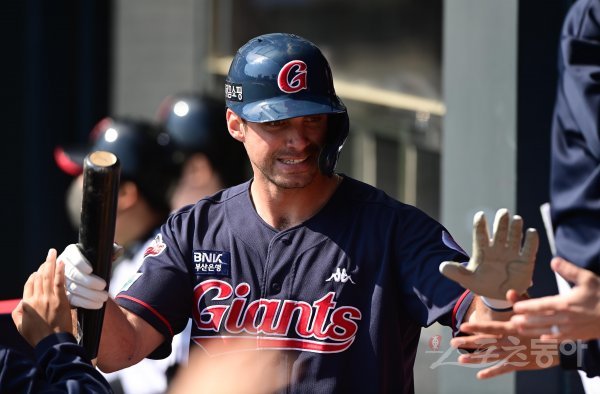 1일 서울 잠실야구장에서 열린 ‘2022 신한은행 SOL KBO리그’ LG 트윈스와 롯데 자이언츠의 경기에서 5회초 1사 2, 3루 롯데 피터스가 1타점을 올리는 희생 플라이를 쳐낸 후 더그아웃에서 동료들의 축하를 받고 있다.