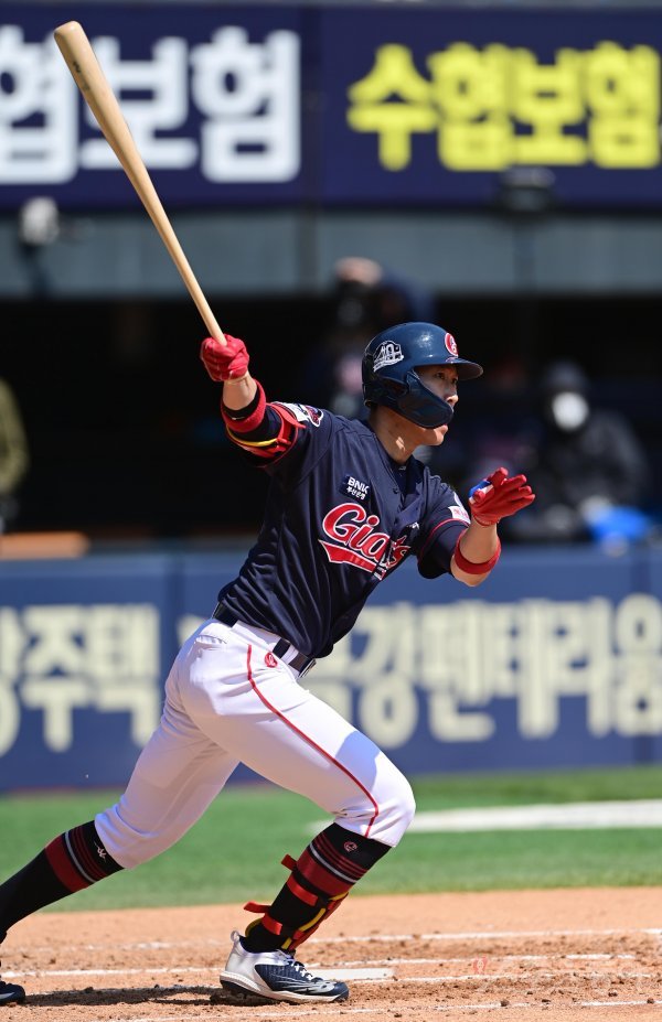 1일 서울 잠실야구장에서 열린 ‘2022 신한은행 SOL KBO리그’ LG 트윈스와 롯데 자이언츠의 경기에서 3회초 무사 롯데 박승욱이 우전 3루타를 치고 있다.