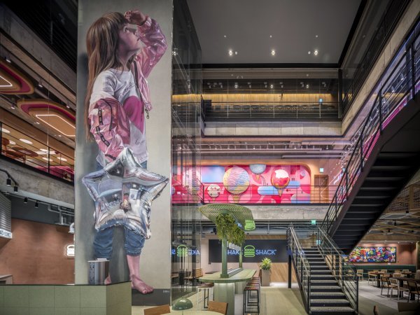 먼저 건물 외관과 엘리베이터, 벽면을 아르헨티나 출신의 세계적인 그래피티 아티스트 마틴 론과 협업해 활기찬 분위기를 연출했다. 1층 쉐이크쉑 매장은 ‘팝핑!’을 주제로 한 그래픽 디자이너 차인철의 드로잉 작품을 통해 에너지 넘치고 새로운 경험을 제공하는 쉐이크쉑을 표현했다.