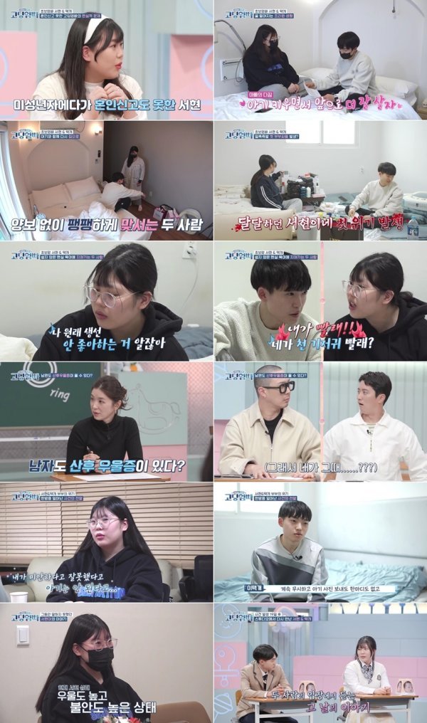두 사람의 다툼을 지켜보던 MC 하하는 “둘이 자주 싸우는 편이냐?”고 조심스럽게 물었다. 박서현은 “하은이가 태어나고 나서, 잠도 거의 못 자고 스트레스도 쌓이다 보니 예민해진 것 같다. 특히나 저 날은 1시간도 못 자서 힘들었다”고 털어놨다. 이에 박재연 심리상담가는 “출산 후 1년 이내는 여성 우울감이 급상승하는 시기다. 서현이처럼 수면이 부족한 것은 물론, 식욕 및 성욕 감퇴 등으로 점점 우울감이 커질 수밖에 없는 상황”이라고 설명했다. 또한 “남자들도 산후우울증에 걸린다”고 덧붙였다. 이에 인교진은 “저도 아이가 태어난 후 커지는 가장의 책임감으로 힘든 마음이 들었다”고 자신의 경험을 이야기했다.