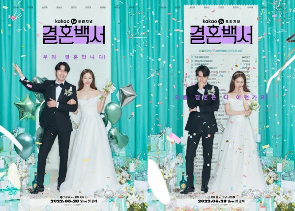 카카오TV 오리지널 ‘결혼백서’(연출 송제영, 서주완, 극본 최이랑, 기획 카카오엔터테인먼트, 제작 메이스엔터테인먼트)는 동화 속 해피엔딩처럼 고생 끝 행복 시작일 것만 같았던 30대 커플의 결혼 준비 과정에서 펼쳐지는 좌충우돌 현실 공감 로맨스다. 앞서 공개된 환상백서 버전의 웨딩 포스터에 이어, 제작진의 예고대로 바로 오늘(2일) 현실백서 버전의 웨딩 포스터가 공개돼 눈길을 끌고 있다.