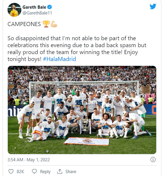 베일은 이날 출전 선수 명단에 포함되지 않았다. 문제는 우승 축하 행사에도 끝내 모습을 보이지 않았다는 것. 레알 마드리드는 경기 후 산티아고 베르나베우에서 우승컵을 들어올리며 35번째 리그 우승을 만끽했다. 이날 부상으로 경기에 나서지 못한 다비드 알라바, 에당 아자르, 루카 요비치 등 모든 선수가 피치에서 함께 어울렸다. 하지만 베일은 그곳에 없었다.