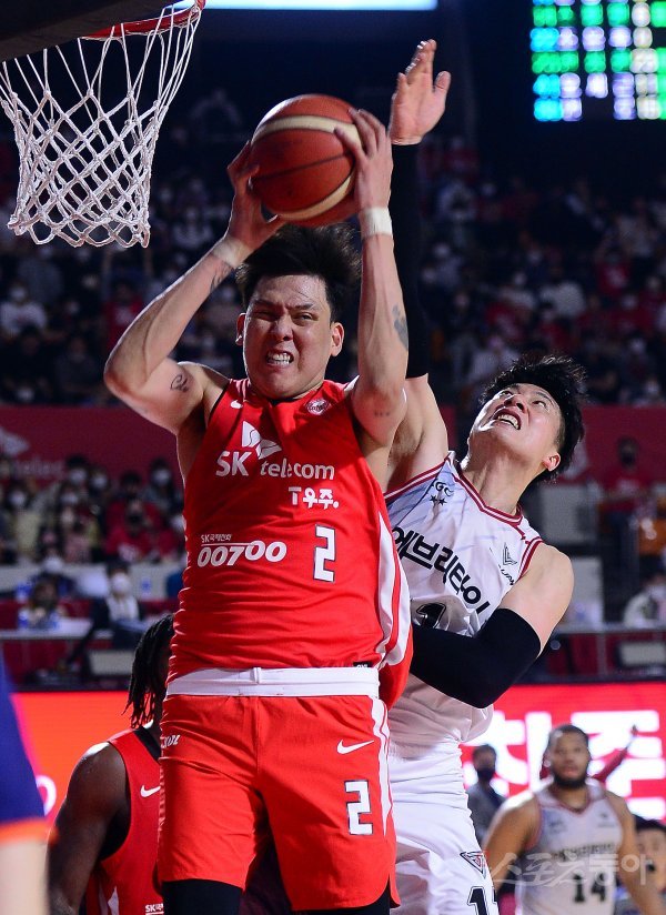 2일 서울 잠실학생체육관에서 열린 ‘2021-2022 정관장 프로농구’ 서울 SK와 안양 KGC의 챔피언결정전 경기에서 sK 최준용이 리바운드를 잡아내고 있다.