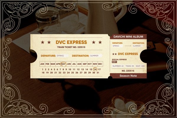 무드 포토의 디자인이 열차 티켓으로 꾸며진 가운데, 다비치의 컴백일을 의미하는 ‘220516’이라는 티켓 번호가 눈에 띈다. 여기에 티켓의 출발지는 ‘봄’, 목적지는 ‘여름’을 가리키고 있으며 오른쪽 하단에는 앨범명 ‘Season Note’가 적혀있어 시선을 사로잡고 있다.