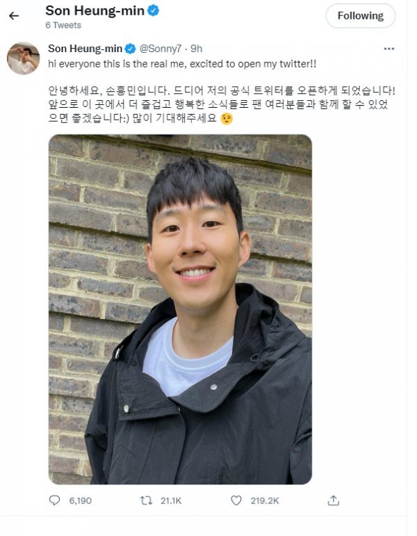 세계적인 스타로 부상한 손흥민(30·토트넘 홋스퍼)이 공식 트위터 계정을 개설했다.