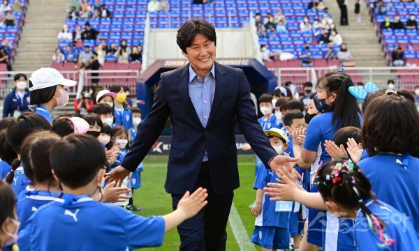 5일 경기도 수원월드컵경기장에서 열린 ‘하나원큐 K리그1 2022’ 수원 삼성과 울산 현대의 경기에 앞서 수원 이병근 감독이 그라운드에 입장하며 어린이 팬들과 인사하고 있다.