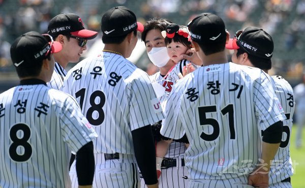 5일 서울 잠실야구장에서 ‘2022 신한은행 MY CAR KBO리그’ 두산 베어스와 LG 트윈스 경기가 열렸다. LG 진해수가 아기와 함께 팀 동료들과 이야기하고 있다.