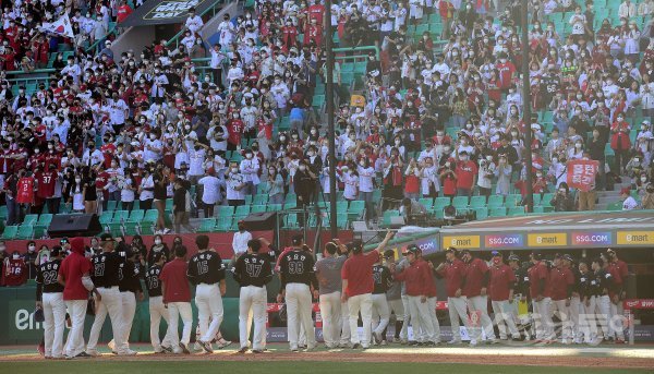 5일 인천 SSG 랜더스필드에서 ‘2022 신한은행 SOL KBO리그’ SSG 랜더스와 한화 이글스의 경기가 열렸다. SSG가 한화를 상대로 14-4로 승리한 뒤 선수들이 팬들에게 인사하고 있다.