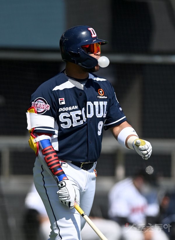 5일 서울 잠실야구장에서 ‘2022 신한은행 MY CAR KBO리그’ 두산 베어스와 LG 트윈스 경기가 열렸다. 3회초 두산 페르난데스 풍선껌을 불며 타석으로 들어가고 있다.