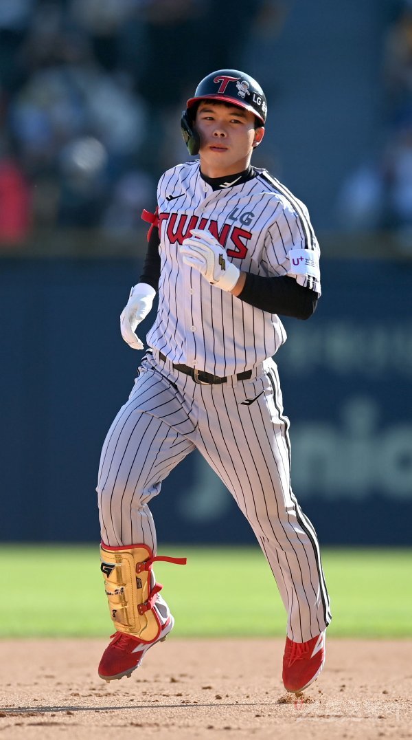 5일 서울 잠실야구장에서 ‘2022 신한은행 MY CAR KBO리그’ 두산 베어스와 LG 트윈스 경기가 열렸다. 8회말 무사 LG 문성주가 중월 솔로 홈런을 날린 후 그라운드를 돌고 있다.