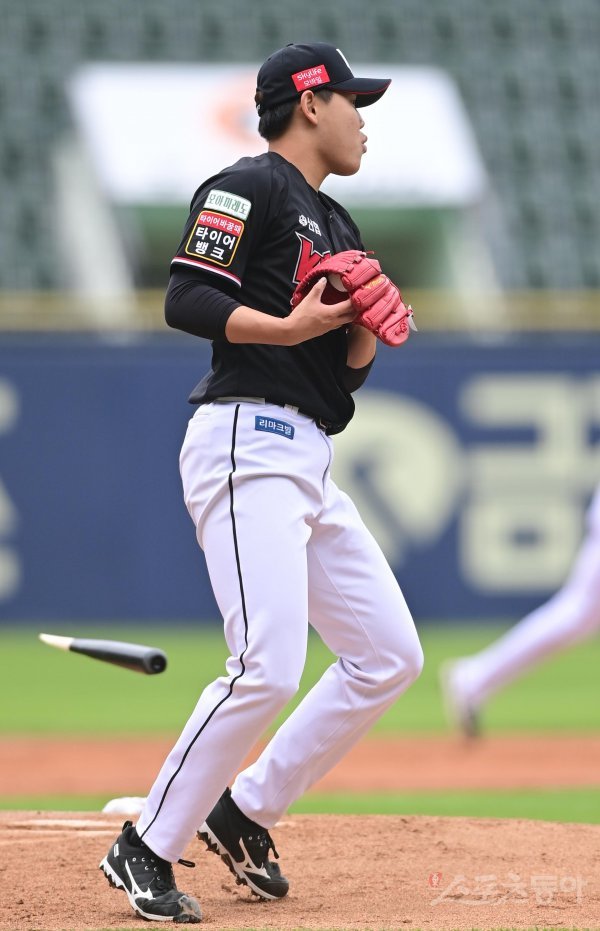 8일 서울 잠실야구장에서 열린 ‘2022 신한은행 SOL KBO리그’ 두산 베어스와 KT 위즈의 경기에서 1회말 2사 KT 소형준이 땅볼 타구를 잡은 뒤 부러진 배트를 피하고 있다.
