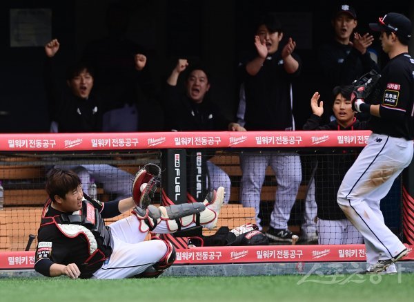 8일 서울 잠실야구장에서 열린 ‘2022 신한은행 SOL KBO리그’ 두산 베어스와 KT 위즈의 경기에서 5회말 무사 두산 강진성의 파울 타구를 잡은 KT 김준태가 동료들의 박수를 받고 있다.