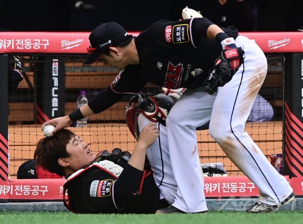 8일 서울 잠실야구장에서 열린 ‘2022 신한은행 SOL KBO리그’ 두산 베어스와 KT 위즈의 경기에서 5회말 무사 두산 강진성의 파울 타구를 잡은 KT 김준태가 김병희의 축하를 받고 있다.