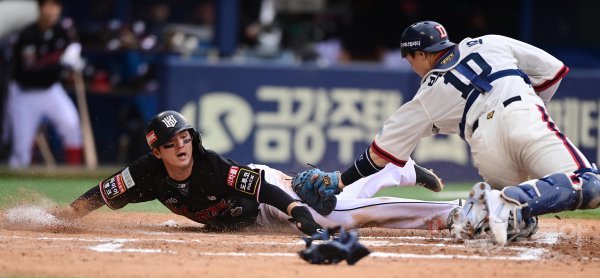 8일 서울 잠실야구장에서 열린 ‘2022 신한은행 SOL KBO리그’ 두산 베어스와 KT 위즈의 경기에서 6회초 무사 2, 3루 KT의 좌익수 뜬공 때 3루주자 김병희가 홈으로 파고들었지만 두산 포수에게 태그 아웃되고 있다.