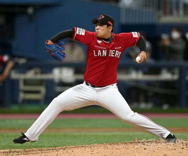 8일 서울 고척스카이돔에서 ‘2022 신한은행 MY CAR KBO리그’ SSG 랜더스와 키움 히어로즈의 열렸다. 9회말 2사 만루 상황에서 등판한 SSG 김택형이 역투하구 있다.