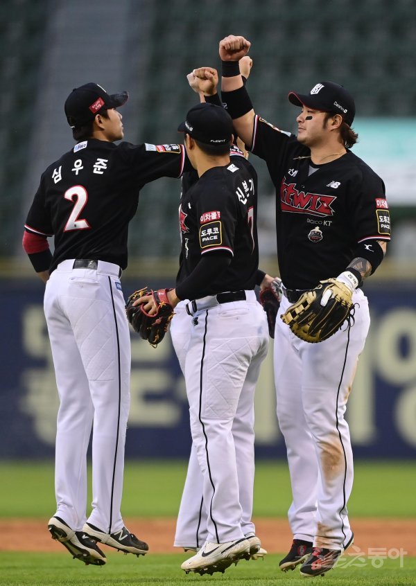 8일 서울 잠실야구장에서 열린 ‘2022 신한은행 SOL KBO리그’ 두산 베어스와 KT 위즈의 경기에서 두산에 5-0으로 승리한 KT 선수들이 기쁨을 나누고 있다.