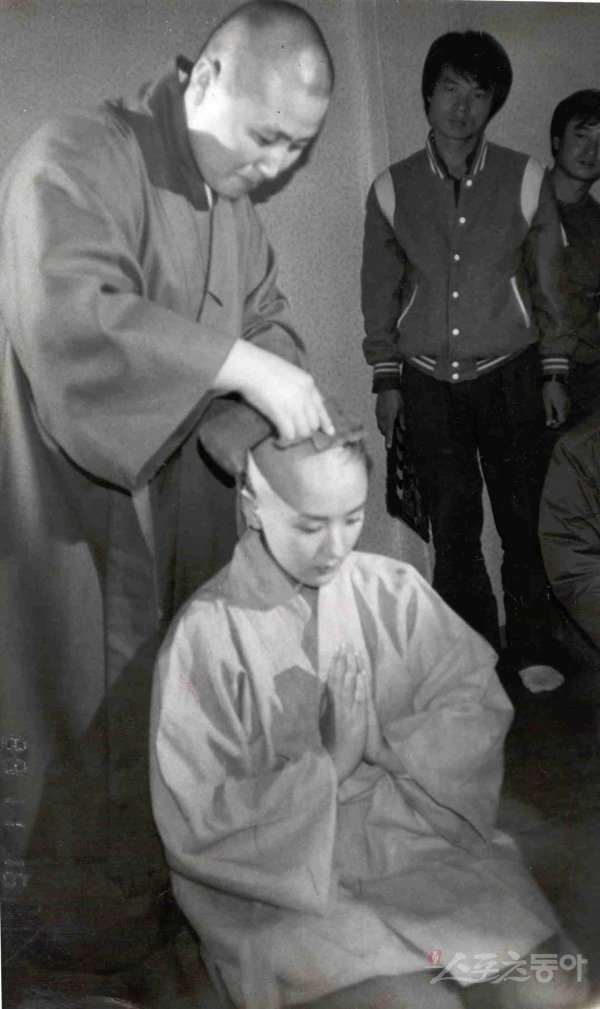 영화 ‘아제 아제 바라아제’서 비구니 역을 하며 촬영 중 삭발하는 강수연. 그는 “머리는 또 자라는 법”이라며 영화에 대한 열정을 불태웠다. 삭발 장면은 한국영화사를 상징하는 역사적인 장면으로 손꼽힌다. 스포츠동아DB