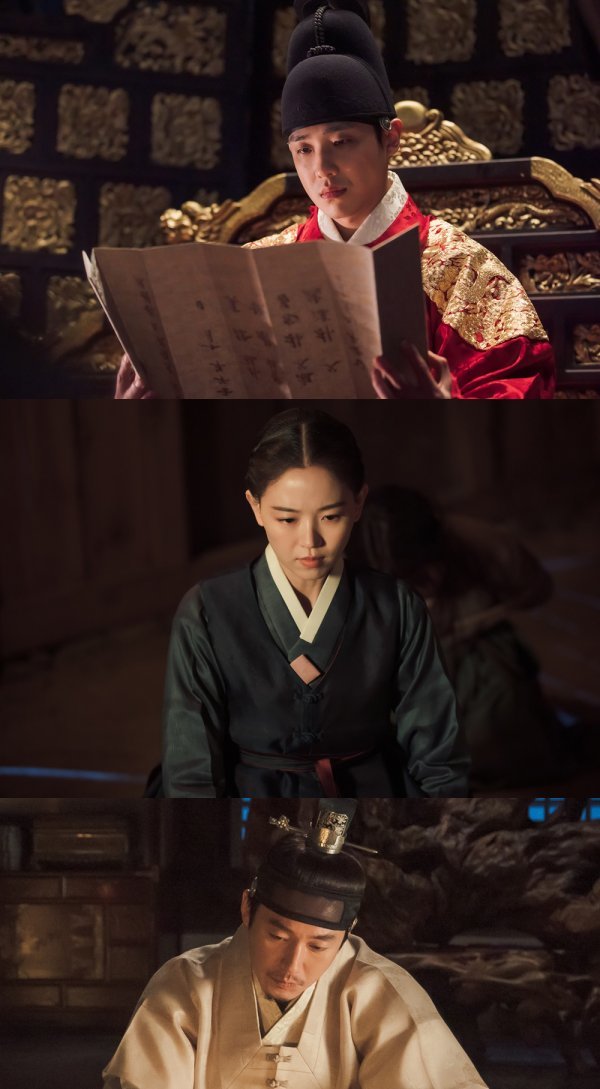 이에 오늘 공개된 사진에는 심상치 않은 분위기를 자아내는 이태, 유정, 그리고 박계원의 모습이 담겼다. 이태는 누군가가 올린 처녀단자를 차갑게 응시하는가 하면, 비릿한 미소를 짓고 있다. 급격히 차가워진 그의 얼굴은 다가올 파란을 짐작하게 하며 그가 보일 행보에 본 방송이 더욱 기다려진다.