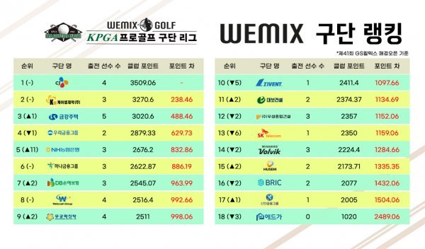 2022시즌 한국프로골프(KPGA) 코리안투어 개막전 ‘제17회 DB손해보험 프로미 오픈’ 종료 후 2005.2포인트로 ‘위믹스 구단 랭킹’ 1위에 올랐던 CJ는 8일 종료된 ‘제41회 GS칼텍스 매경오픈’에서 1503.86점을 추가해 총 3509.06포인트로 1위 자리를 지켰다.