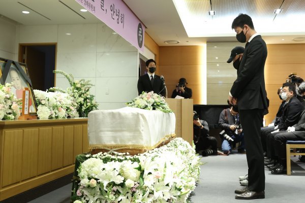 배우 고 강수연의 영결식이 11일 서울 강남구 일원동 삼성서울병원 장례식장에서 엄수됐다. 배우 정우성이 묵념을 하고 있다.