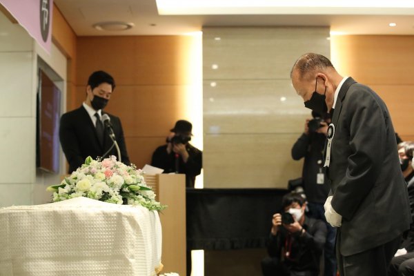 배우 고 강수연의 영결식이 11일 서울 강남구 일원동 삼성서울병원 장례식장에서 엄수됐다. 김동호 강릉국제영화제 이사장이 추도사를 마친 후 인사하고 있다.