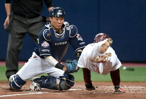 11일 서울 고척스카이돔에서 ‘2022 신한은행 MY CAR KBO리그’ 두산 베어스와 키움 히어로즈의 열렸다. 3회말 2사 1루 키움 내야 땅볼 때 두산 투수 송구 실책하는 사이 1루주자 김태진이 홈까지 달렸으나 아웃되고 있다.