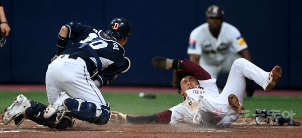 11일 서울 고척스카이돔에서 ‘2022 신한은행 MY CAR KBO리그’ 두산 베어스와 키움 히어로즈의 열렸다. 3회말 2사 1루 키움 내야 땅볼 때 두산 투수 송구 실책하는 사이 1루주자 김태진이 홈까지 달렸으나 아웃되고 있다.