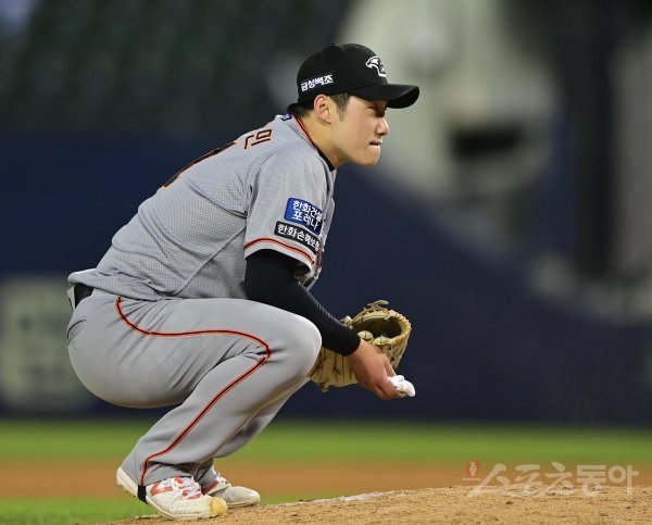 11일 서울 잠실야구장에서 열린 ‘2022 신한은행 SOL KBO리그’ LG 트윈스와 한화 이글스의 경기에서 4회말 무사 1, 3루 상황에서 LG에 1타점 적시타를 허용한 한화 남지민이 아쉬워하고 있다.
