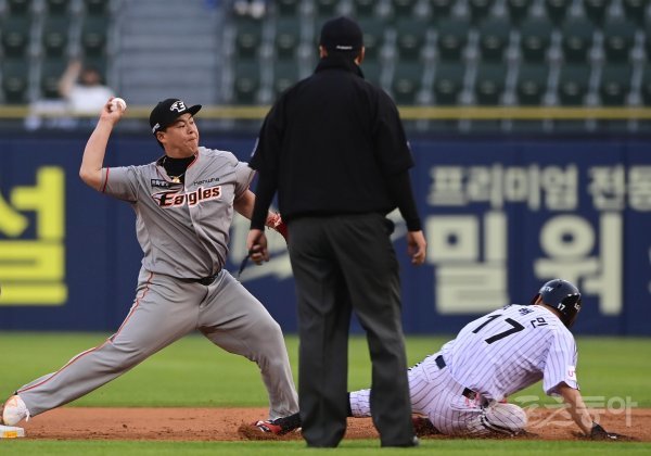 11일 서울 잠실야구장에서 열린 ‘2022 신한은행 SOL KBO리그’ LG 트윈스와 한화 이글스의 경기에서 1회말 1사 1루 LG의 내야 땅볼 때 한화 3루수 노시환이 1루주자를 포스 아웃시킨 후 1루로 송구하고 있다.