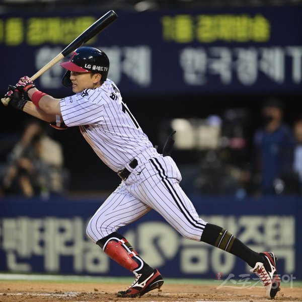 11일 서울 잠실야구장에서 열린 ‘2022 신한은행 SOL KBO리그’ LG 트윈스와 한화 이글스의 경기에서 2회말 2사 만루 LG 박해민이 2타점 중전 적시타를 치고 있다.