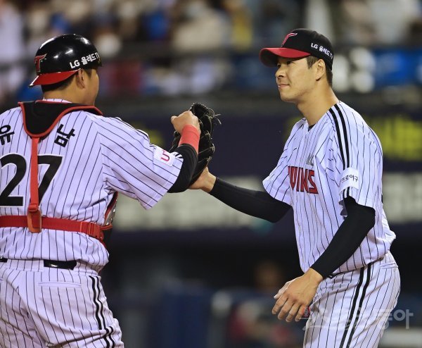 11일 서울 잠실야구장에서 열린 ‘2022 신한은행 SOL KBO리그’ LG 트윈스와 한화 이글스의 경기에서 6회초 수비를 마친 LG 김대유가 포수와 기쁨을 나누고 있다.