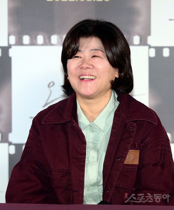 12일 서울 용산구 CGV용산아이파크몰에서 열린 영화 ‘오마주’ 언론 시사회에 참석한 이정은이 기자회견도중 미소를 짓고 있다. ‘오마주’는 한국 1세대 여성 영화 감독의 작품 필름을 복원하게 된 중년 여성 감독 지완의 현재와 과거를 넘나드는 시간 여행을 통해 일상, 환상을 오가는 여정을 담았다.
