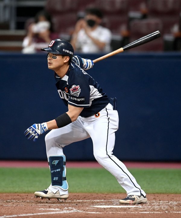 12일 서울 고척스카이돔에서 ‘2022 신한은행 MY CAR KBO리그’ 두산 베어스와 키움 히어로즈의 열렸다. 6회초 무사 1,2루 두산 안권수가 중전 안타를 치고 있다.