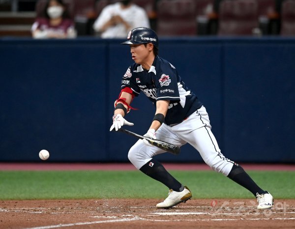 12일 서울 고척스카이돔에서 ‘2022 신한은행 MY CAR KBO리그’ 두산 베어스와 키움 히어로즈의 열렸다. 6회초 무사 1루 두산 정수빈이 번트 안타를 치고 있다.