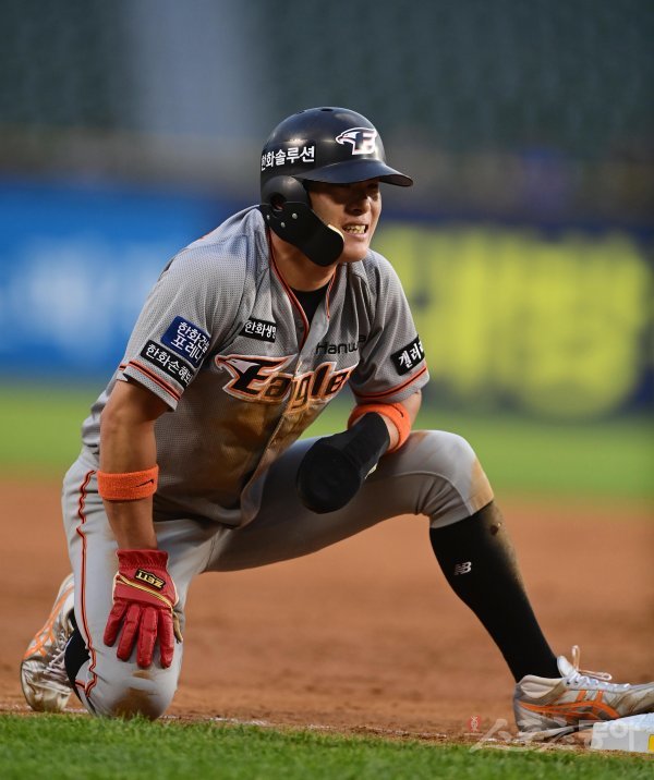 12일 서울 잠실야구장에서 열린 ‘2022 신한은행 SOL KBO리그’ LG 트윈스와 한화 이글스의 경기에서 2회초 2사 2루 상황에서 한화 2루주자 노수광이 3루로 도루를 시도했지만 아웃된 후 아쉬워하고 있다.