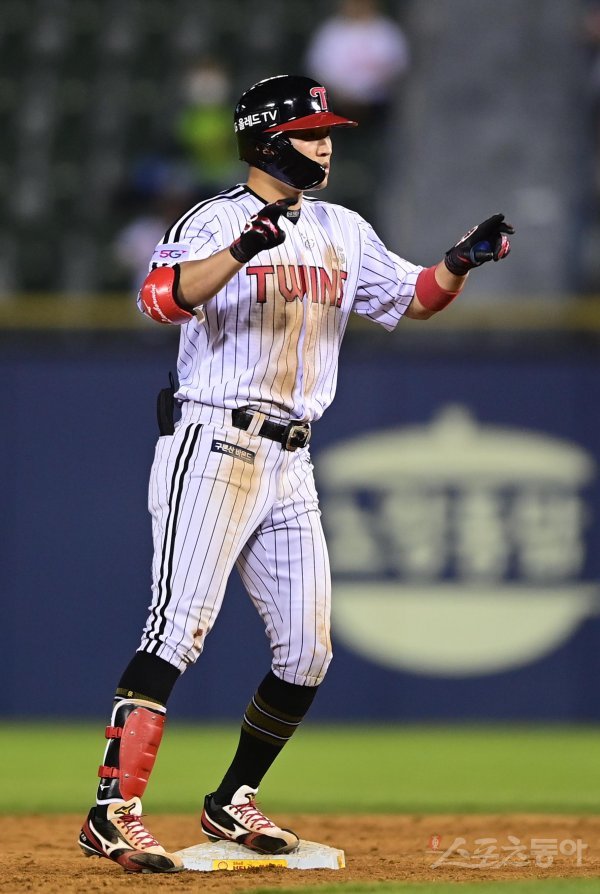 12일 서울 잠실야구장에서 열린 ‘2022 신한은행 SOL KBO리그’ LG 트윈스와 한화 이글스의 경기에서 4회말 1사 3루 LG 박해민이 1타점 우전 2루타를 쳐낸 뒤 세리머니를 하고 있다.