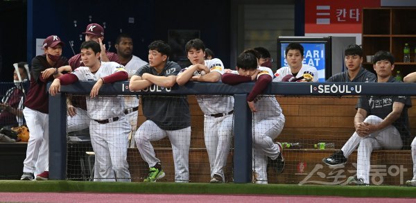 12일 서울 고척스카이돔에서 ‘2022 신한은행 MY CAR KBO리그’ 두산 베어스와 키움 히어로즈의 열렸다. 2-3으로 패하며 5연패에 빠진 키움 선수들이 9회말 공격을 바라보고 있다.