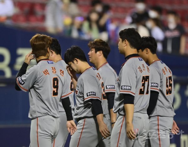 12일 서울 잠실야구장에서 열린 ‘2022 신한은행 SOL KBO리그’ LG 트윈스와 한화 이글스의 경기에서 LG에 7-11로 패한 한화 선수들이 더그아웃으로 향하고 있다.