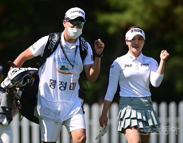 15일 경기도 용인시 수원컨트리클럽에서 열린 KLPGA투어 ‘2022 NH투자증권 레이디스 챔피언십’ 1번홀에서 티샷을 마친 황정미가 캐디와 포즈를 취하고 있다.