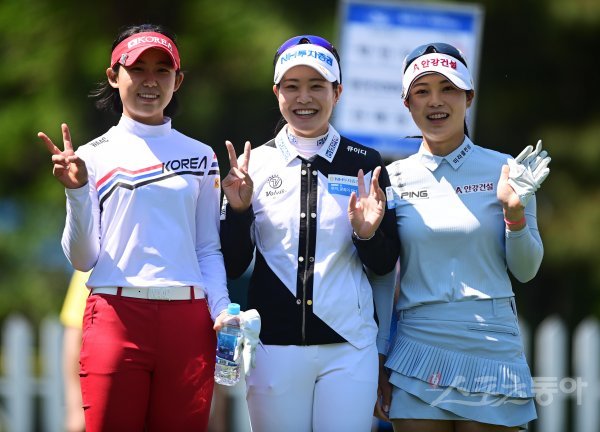 15일 경기도 용인시 수원컨트리클럽에서 열린 KLPGA투어 ‘2022 NH투자증권 레이디스 챔피언십’ 1번홀에서 티샷을 마친 황유민, 박민지, 전예성이 포즈를 취하고 있다.