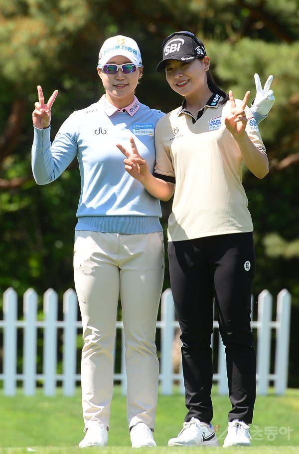 15일 경기도 용인시 수원컨트리클럽에서 열린 KLPGA투어 ‘2022 NH투자증권 레이디스 챔피언십’ 1번홀에서 티샷을 마친 정윤지와 이소미가 포즈를 취하고 있다.