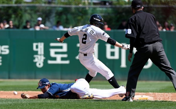 15일 인천 SSG 랜더스필드에서 ‘2022 신한은행 SOL KBO리그’ SSG 랜더스와 NC 다이노스의 경기가 열렸다. 3회말 무사 1, 2루에서 번트 아웃 때 SSG 박성한이 황급히 2루로 귀루하고 있다.