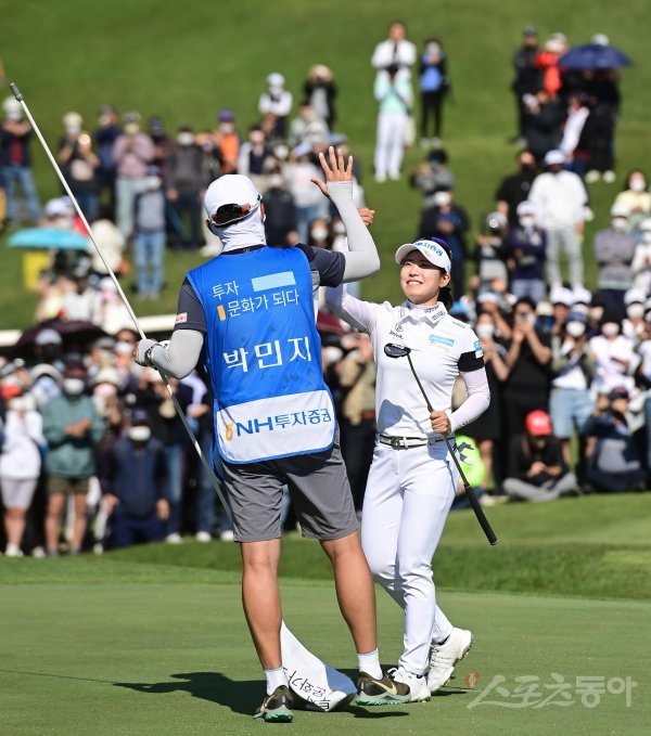 15일 경기도 용인시 수원컨트리클럽에서 열린 KLPGA투어 ‘2022 NH투자증권 레이디스 챔피언십’에서 박민지가 11언더파로 우승을 확정지은 뒤 캐디와 기쁨을 나누고 있다.