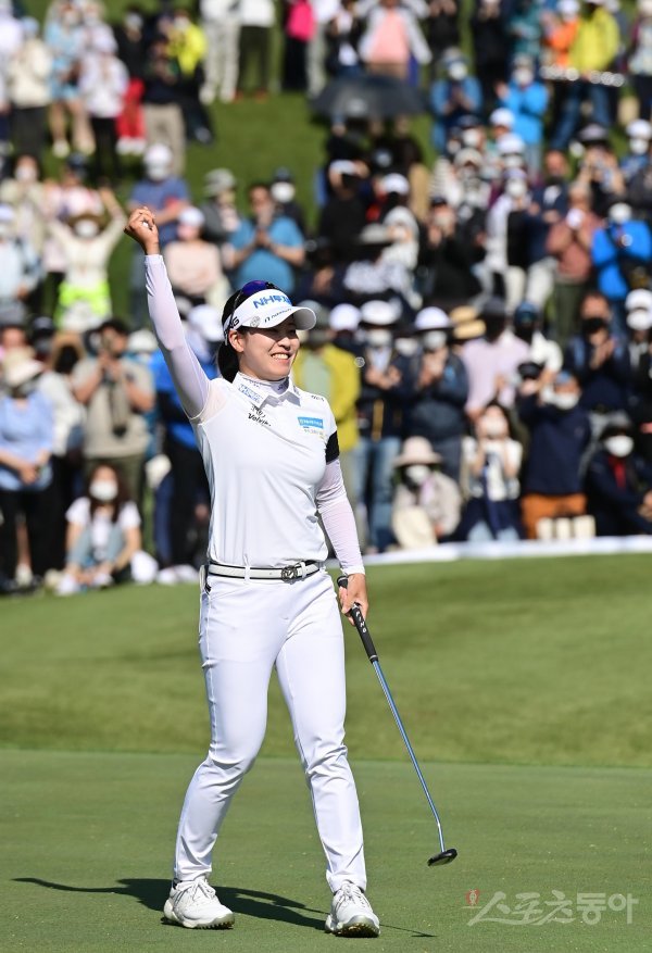 15일 경기도 용인시 수원컨트리클럽에서 열린 KLPGA투어 ‘2022 NH투자증권 레이디스 챔피언십’에서 박민지가 11언더파로 우승을 확정지은 뒤 세리머니를 하고 있다.