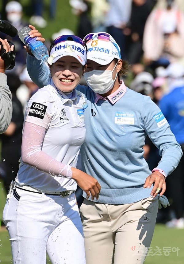 15일 경기도 용인시 수원컨트리클럽에서 열린 KLPGA투어 ‘2022 NH투자증권 레이디스 챔피언십’에서 박민지가 11언더파로 우승을 확정지은 뒤 정윤지의 축하를 받고 있다.
