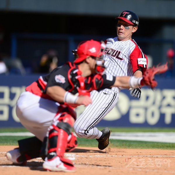 15일 서울 잠실야구장에서 ‘2022 신한은행 MY CAR KBO리그’ KIA 타이거즈와 LG 트윈스 경기가 열렸다. 6회말 1사 1,3루 LG 외야 뜬공 때 3루주자 서건창이 태그업 시도해 홈에서 세이프 되고 있다.