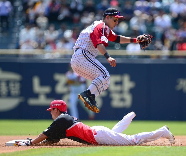 15일 서울 잠실야구장에서 ‘2022 신한은행 MY CAR KBO리그’ KIA 타이거즈와 LG 트윈스 경기가 열렸다. 1회초 2사 1루 상황에서 KIA 1루주자 류지혁이 2루 루에 성공하고 있다.